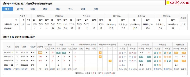 > 292期福彩3D试机号510对应开奖号的组选分析结果